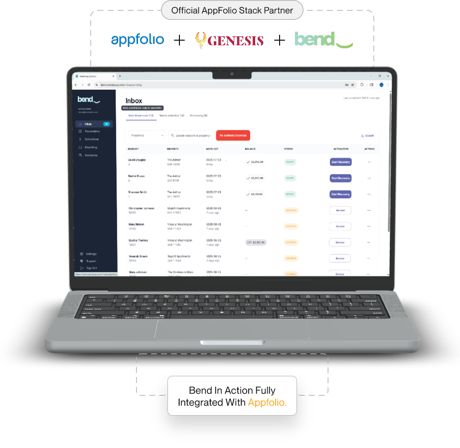 Genesis helps rental real estate teams recover past-resident balances quickly, compliantly, and with full transparency. Through our integration with AppFolio, you can manage recovery in-house with Bend automation or escalate to Genesis for licensed third-party collections.